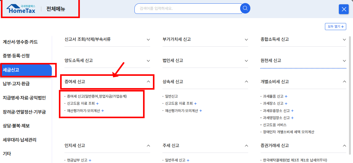 - 전체메뉴 →세금신고-> 증여세 선택