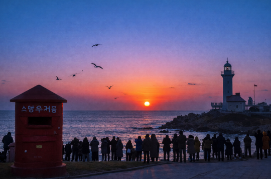 빨간 소망우체통 옆에서 수평선 일출