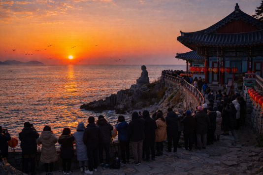 사찰 지붕 실루엣 + 바다 위 태양 조합이 가장 인기