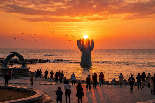 바다 위에 떠 있는 상생의 손 + 해돋이 한 프레임